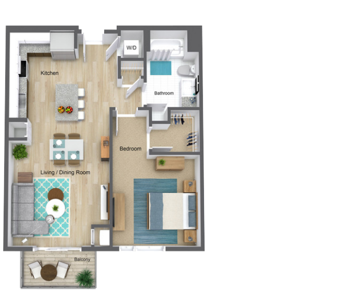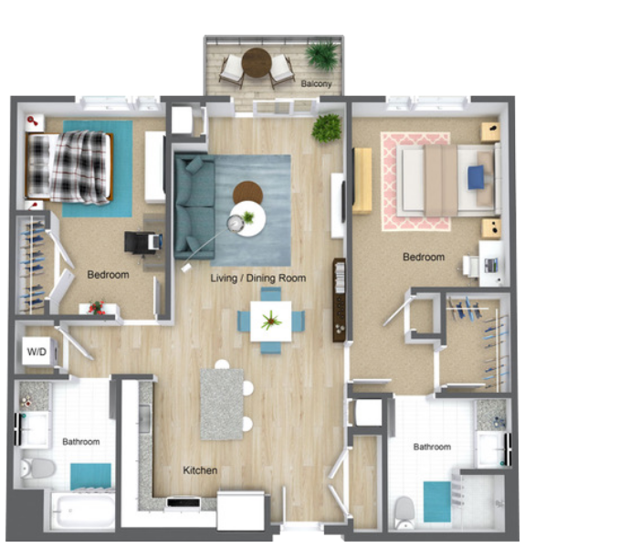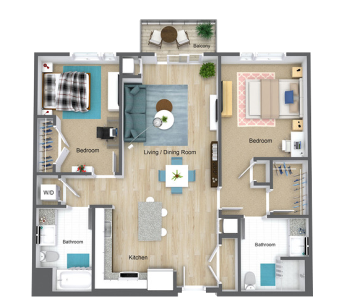 2 bathsView PricingTwo bedrooms, two bathrooms, featuring luxury finishes, open-concept living space and kitchen with island and granite counters, in-home laundry, and ample closet space.