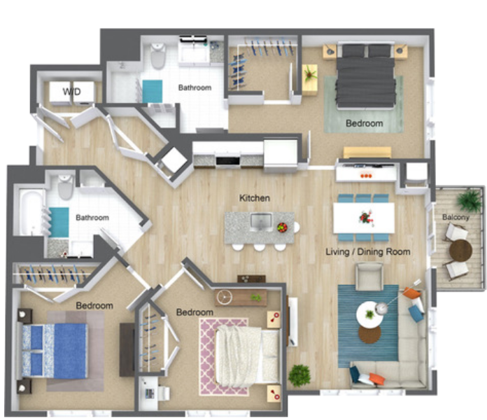 2 bathsView PricingThree bedrooms with ample closet space, two bathrooms, featuring luxury finishes, open-concept living space and kitchen with island and granite counters, in-home laundry.